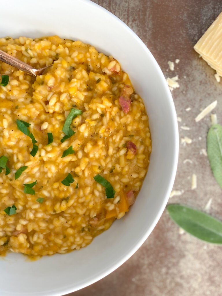 - Once your rice is soft and chewy, remove from the heat. Stir in your butternut squash purée, parmesan cheese, crispy pancetta and black pepper.