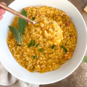 This creamy sweet caramelized onion butternut squash risotto has all of the sweet and savory fall flavors sprinkled with warm and cozy spices.