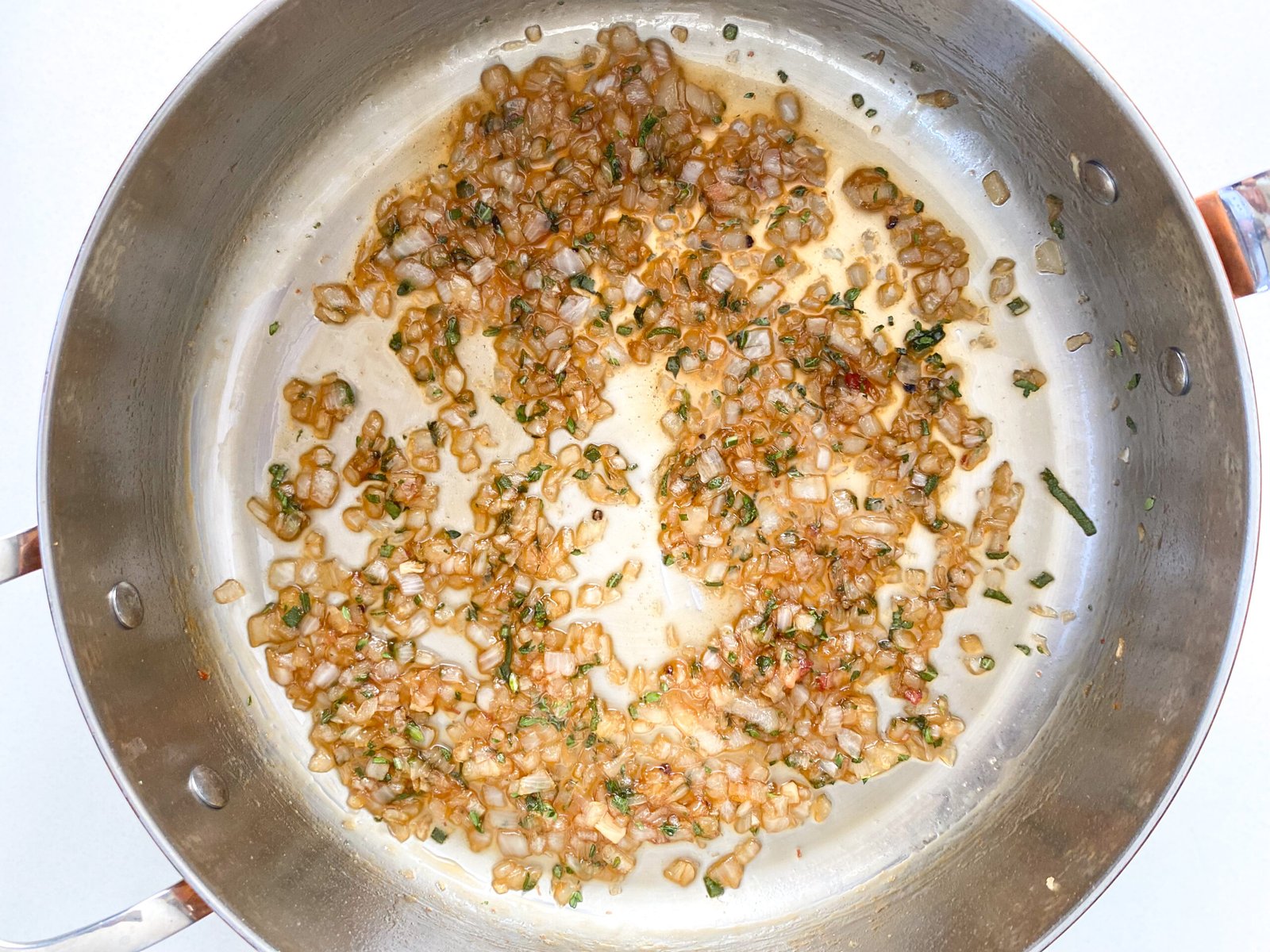 - Over medium heat, in the same pan as the pancetta fat, add in your onion, fresh herbs and salt. Slowing cook your onions until they are soft, translucent and the herbs become fragrant. Continue to cook until they are a rich brown caramelized color, stirring occasionally to prevent burning.
