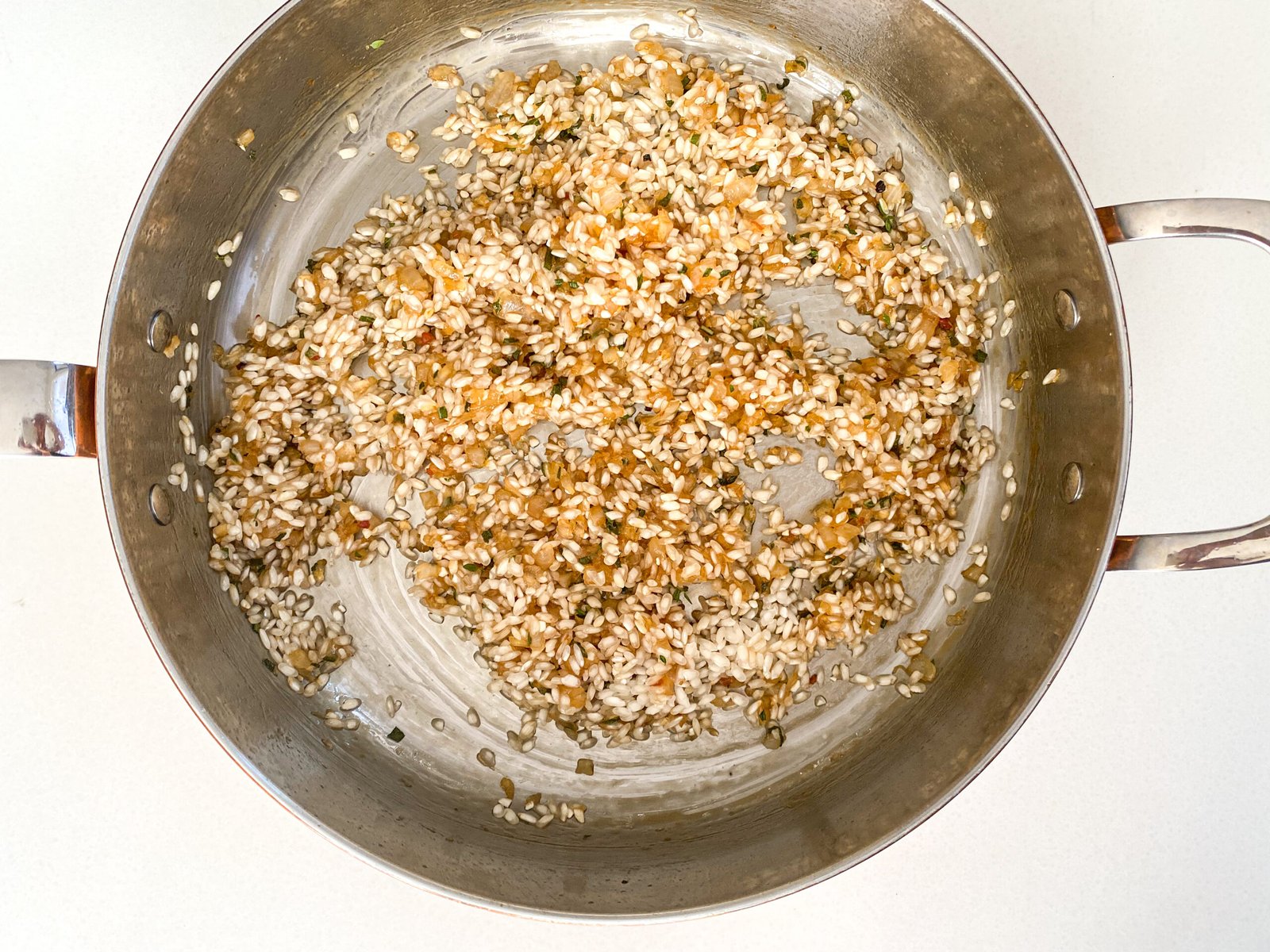 - Once your onions are soft and caramelized, add in your arborio rice and deglaze with your white wine. Pour in your wine and allow it to evaporate almost entirely.