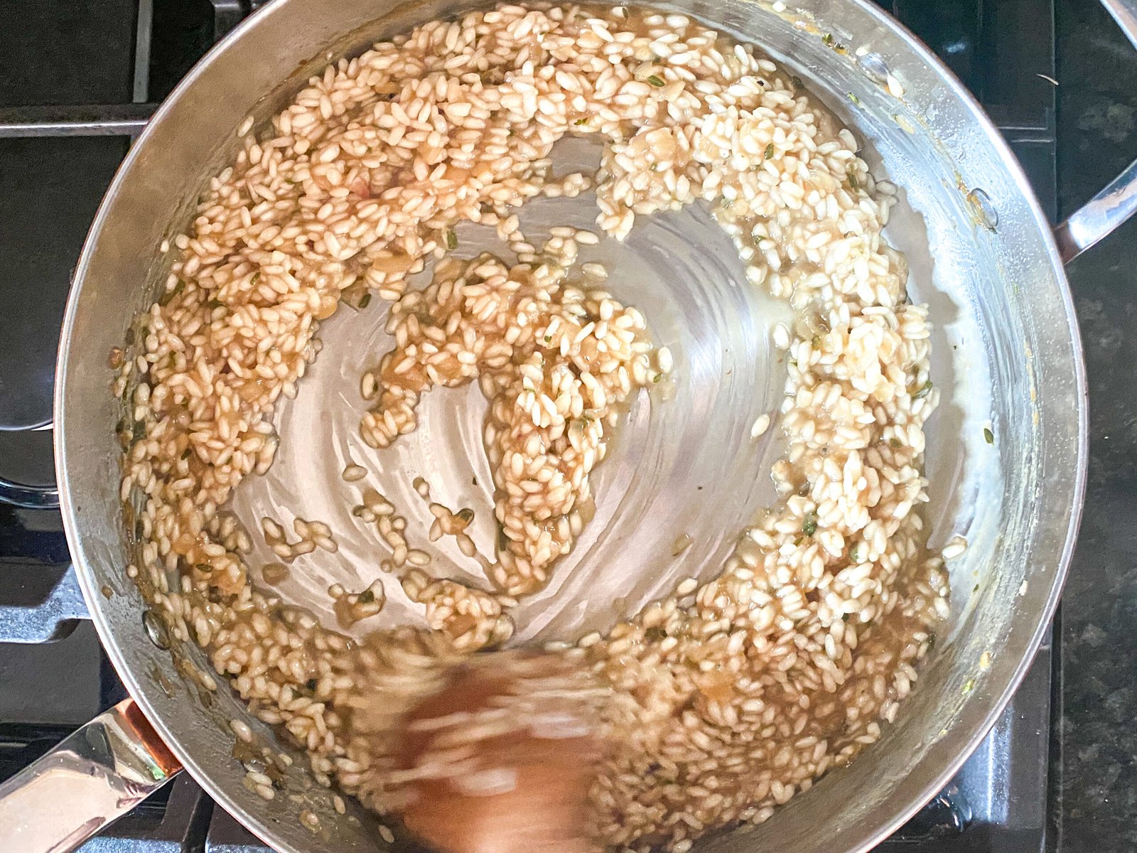 - As your stock leaves the pan you will want to add another ½ ladle of your hot stock as you continue to stir. Let the stock almost dry up before adding your next ladle. Stir. Stir. Stir.