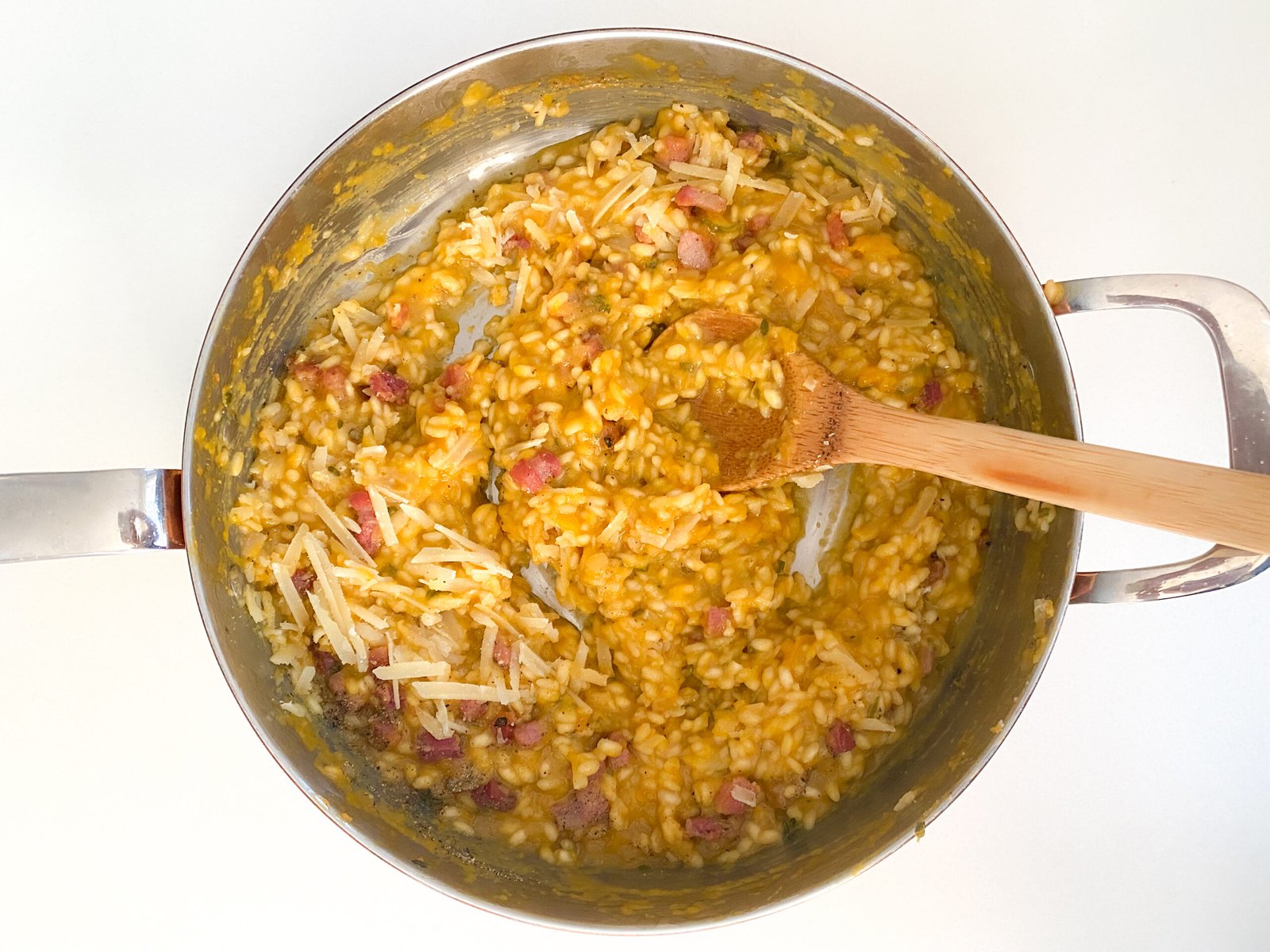 - Once your rice is soft and chewy, remove from the heat. Stir in your butternut squash purée, parmesan cheese, crispy pancetta and black pepper.