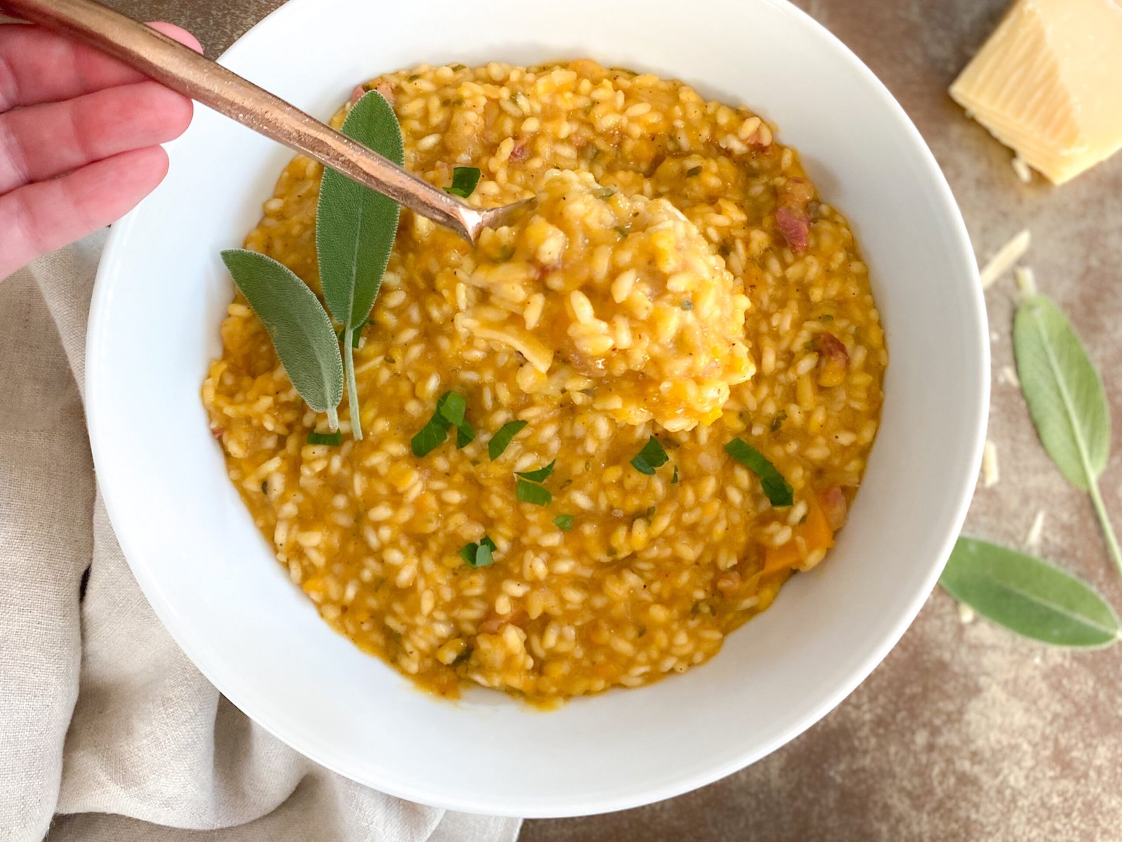 This creamy sweet caramelized onion butternut squash risotto has all of the sweet and savory fall flavors sprinkled with warm and cozy spices.
