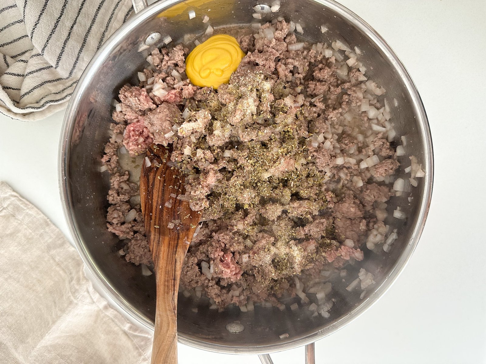 - Add in the mustard, garlic salt and oregano. Stir to combine and let it cook for about 1 minute.1 TBSP Yellow Mustard, 1 tsp Oregano, 2 tsp Garlic Salt