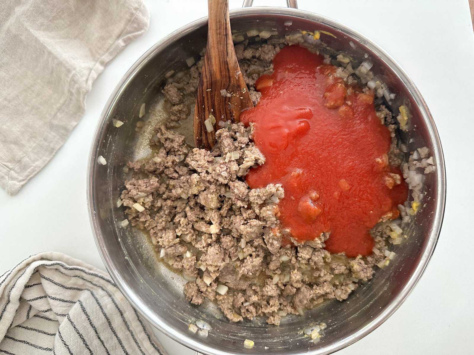 - In a large pan, over medium heat, add the ground beef and diced onion. Using a spatula, break up the ground beef into small pieces. Cook until the ground beef is brown and the onions are fragrant and soft, about 5 minutes.1 lb Ground Beef, 1 cup Onion - small diced