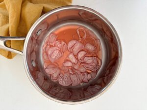 In a small sauce pan, add red wine vinegar, water, smashed garlic cloves, a pinch of salt, sugar and the thinly sliced shallots. Heat up the liquid until it starts to have a low rolling bubble boil. Once the boil starts, turn down the heat slightly and let it simmer for about 5 minutes. Then turn off the heat and keep the shallots in the pan until you’re ready to use them, about 10 minutes. The crunchy tangy sweet shallots will add another irresistible layer of flavor.