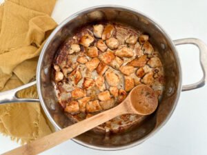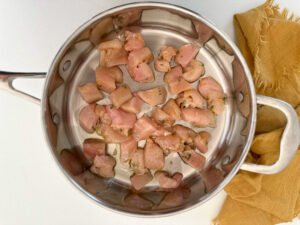 - In a pan, over medium-high heat, add 1 TBSP of olive oil and heat up to a simmer. Add in the chicken.