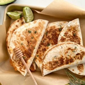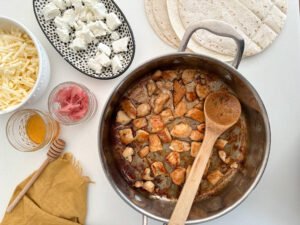 I am so excited to share this recipe, it was inspired by a restaurant near my daughters’ pediatrician. When the weather is nice we sit outside, with the warm sunshine, a chicken goat cheese quesadilla and an iced tea (or margarita) – it’s a whole vibe. I always try to schedule their appointments around lunch so I can go.