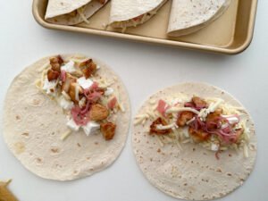 - Lay out a tortilla on half of the circle, sprinkle on a handful of monterey jack cheese so that it covers the bottom, layer on some shallots, goat cheese and chicken.