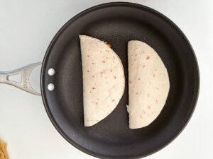 - Heat up a large non-stick pan to medium heat. Spray each side of the tortilla and place it down in the pan. Let it brown and crisp up while the cheese melts inside.