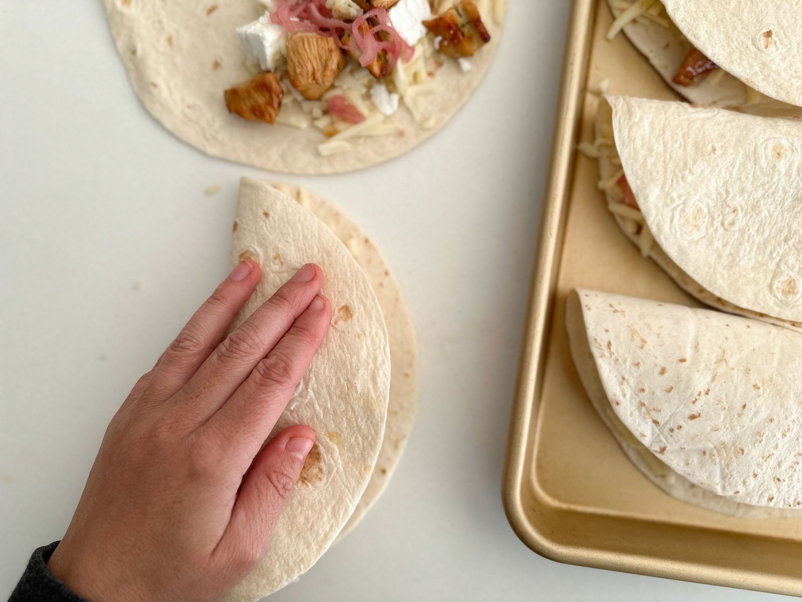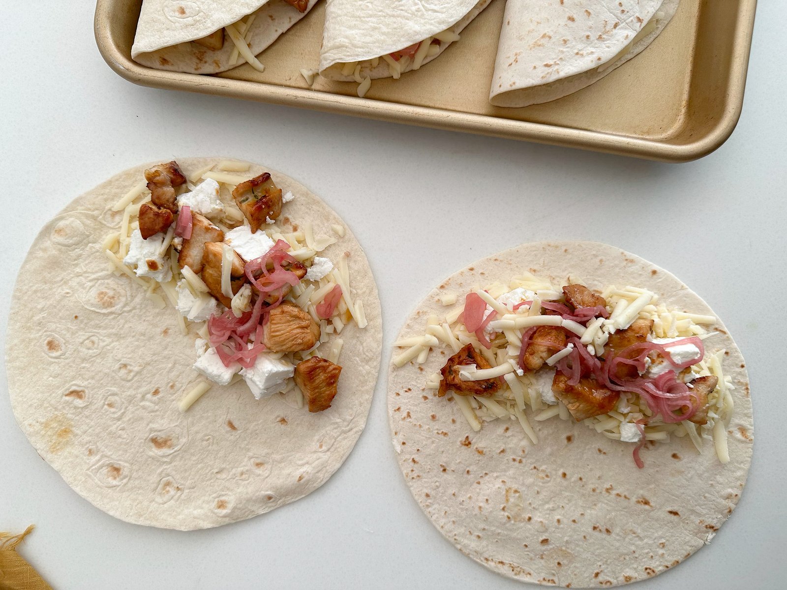 - Lay out a tortilla on half of the circle, sprinkle on a handful of monterey jack cheese so that it covers the bottom, layer on some shallots, goat cheese and chicken.
