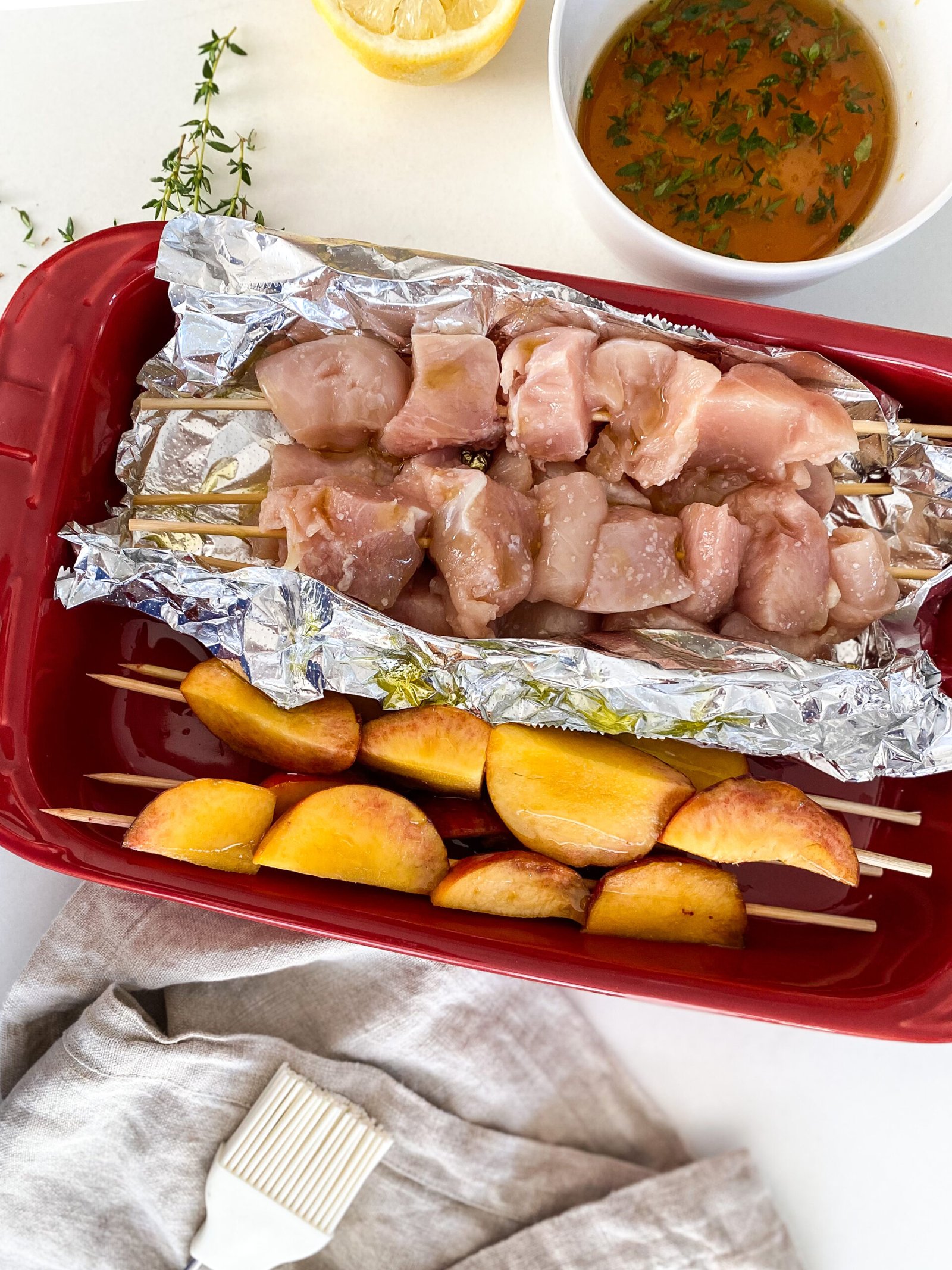 Grilled kabobs are such an easy and fun way to make a summertime weeknight dinner and these honey-thyme chicken and peach kabobs are no exception! Skip the marinade, for this recipe we are using a brush-on glaze as we grill, the honey will leave caramelized grill marks and the thyme will become fragrant while the chicken cooks.