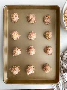 - Using a meatball scoop or a spoon, scoop them into 2 inch balls and place on your sheet-pan. They will be a little wet and sticky.