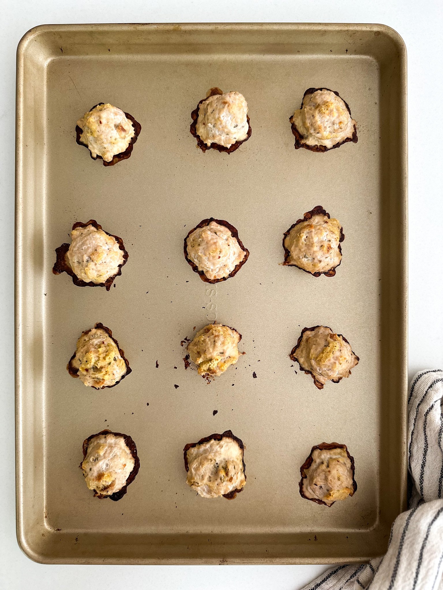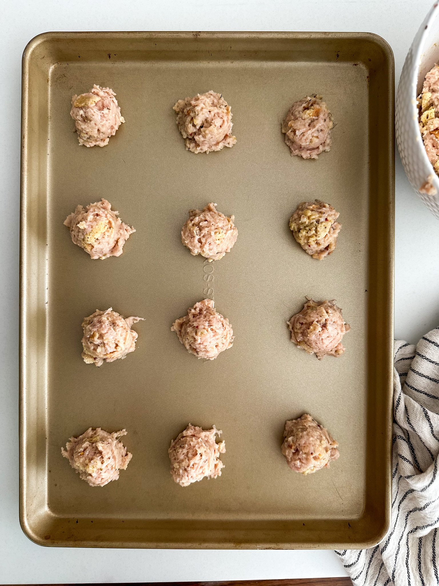 - Using a meatball scoop or a spoon, scoop them into 2 inch balls and place on your sheet-pan. They will be a little wet and sticky.