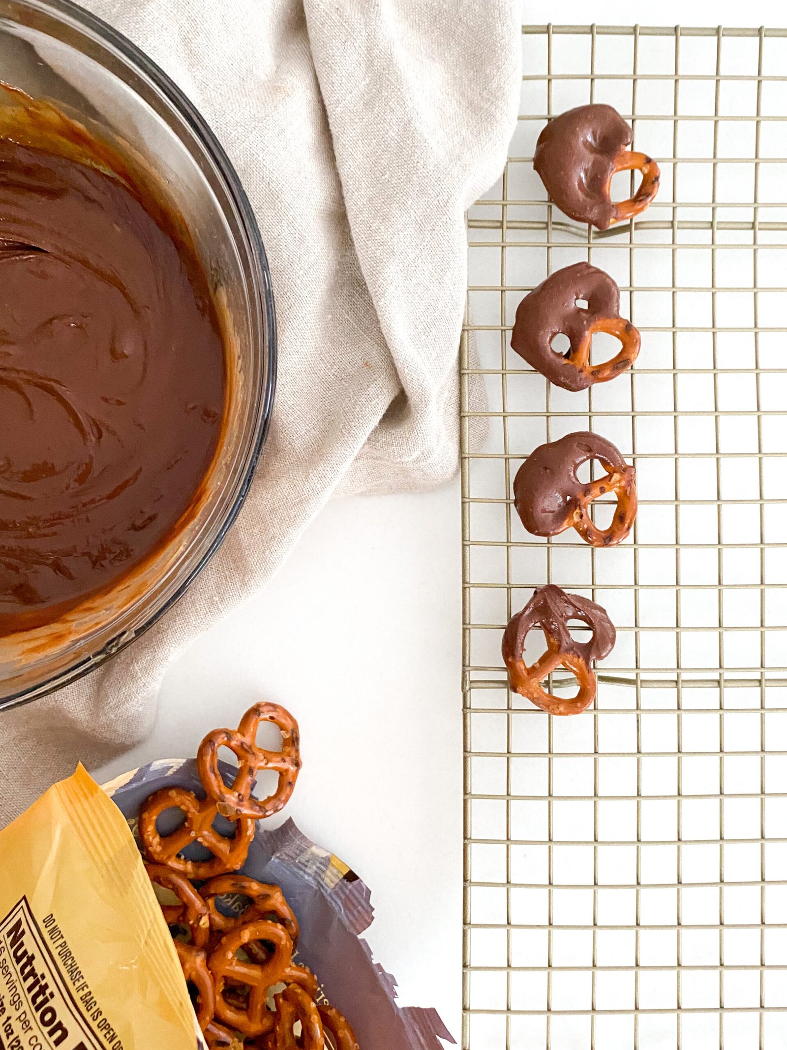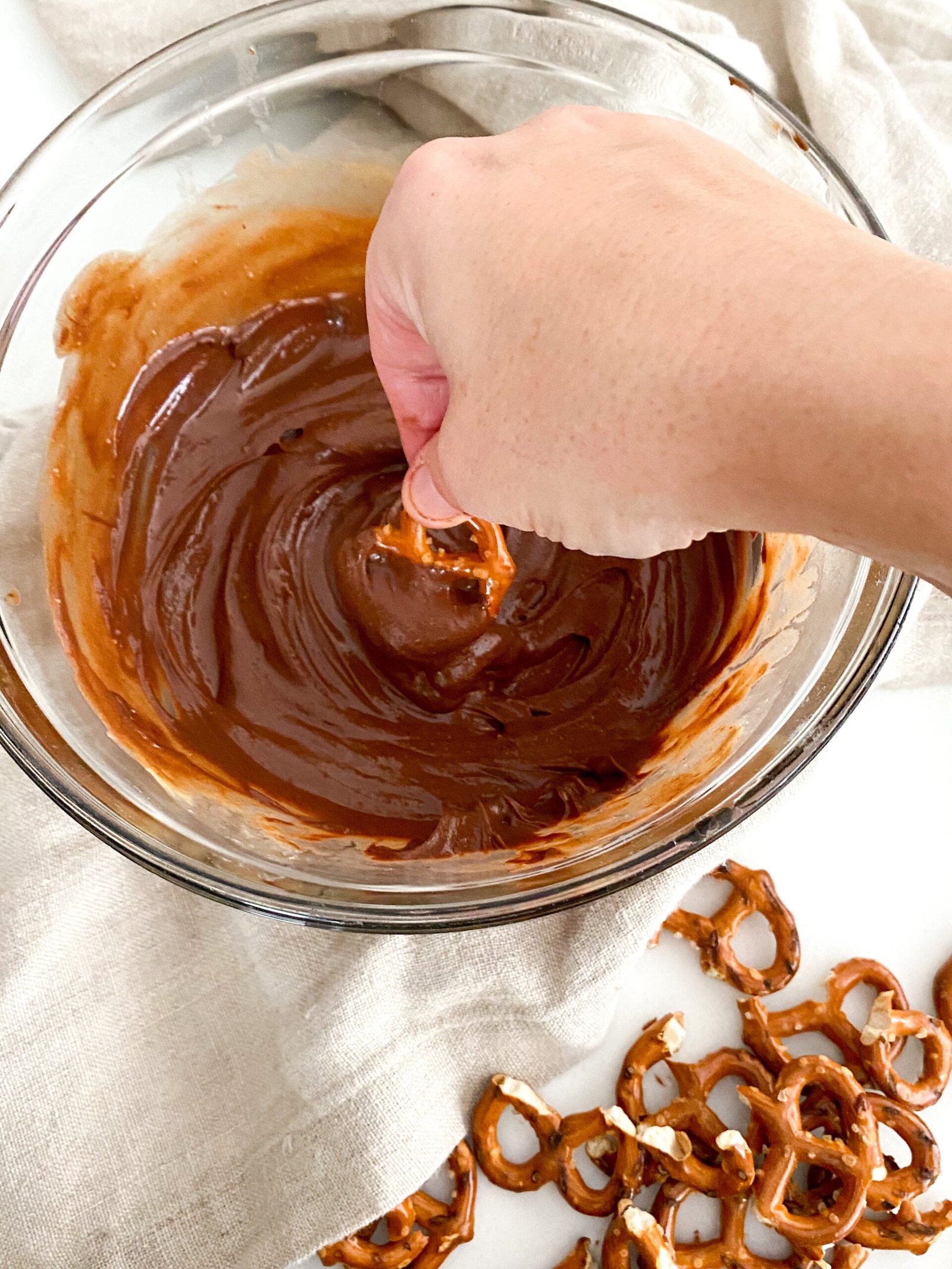 - Set out a wire rack. Holding onto the side of the pretzel, dip ½ or ? of each pretzel into the melted chocolate mixture, give it a quick tap on the side of the bowl or a light shake to remove the excess chocolate mixture.