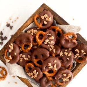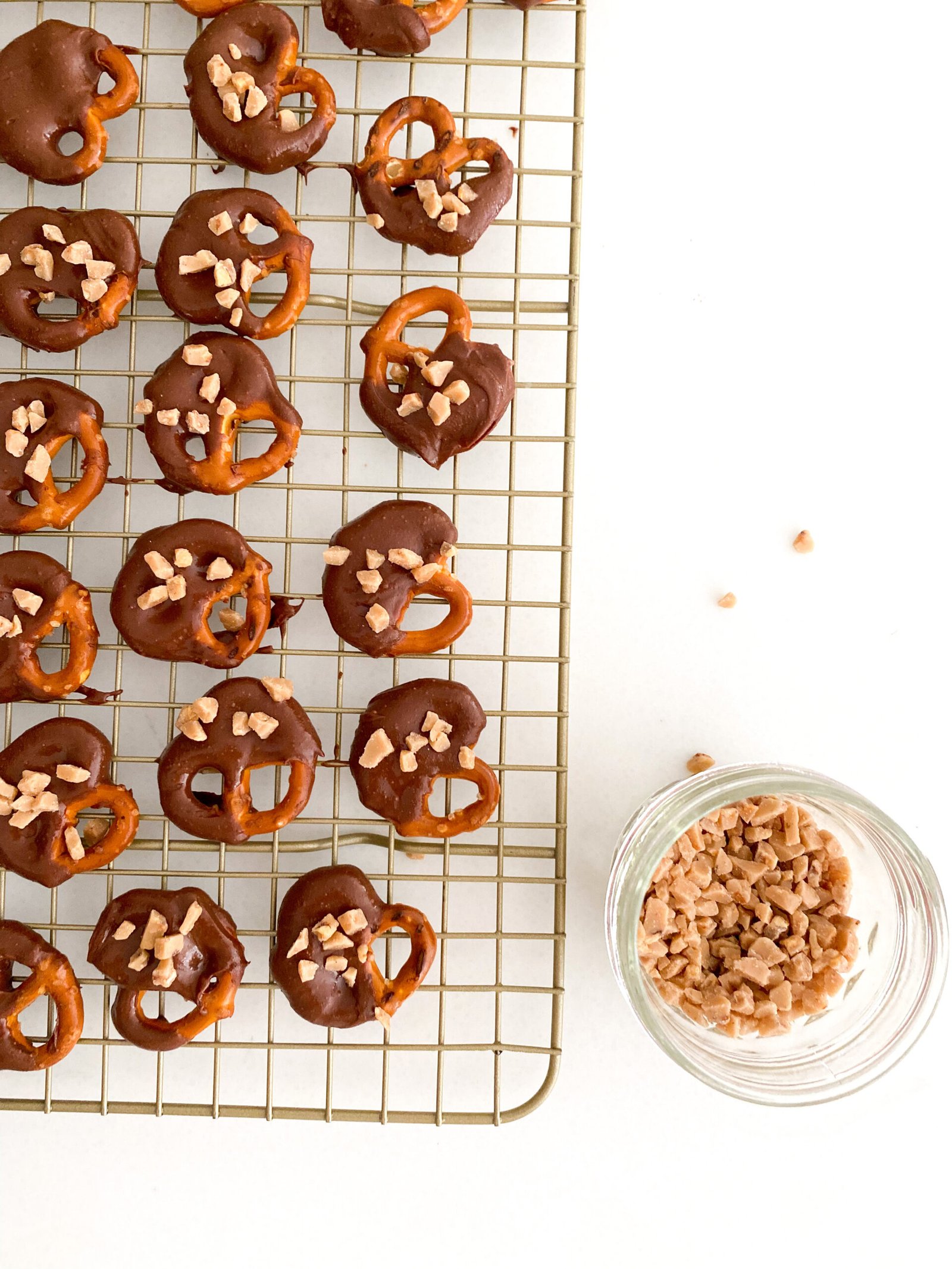 Snowed-in days call for these easy peanut butter and chocolate dipped pretzels. The irresistible ratio of sweet to salty is perfected in this recipe and if you really want to level it up, sprinkle on some toffee bits. If your pantry is like mine, you’ll have all four of the ingredients waiting for you. The toffee bits were a pleasant surprise, so if you’re running to the store for the obligatory snow day bread and milk, snag a bag in the bakery aisle!