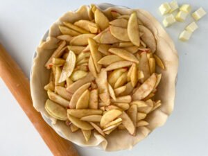 - Pour in your apple pie filling mix. Dot the top with cubed cold butter.