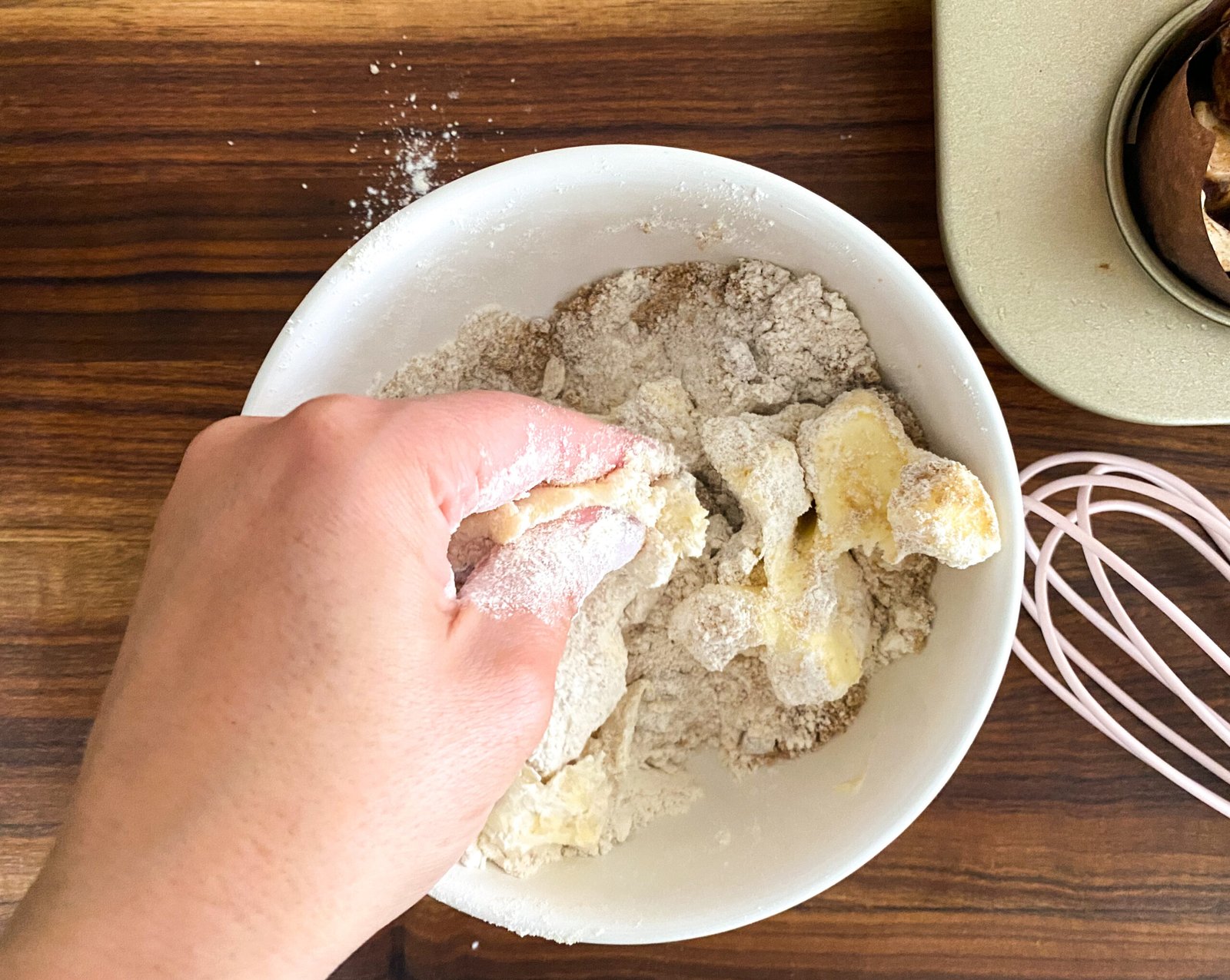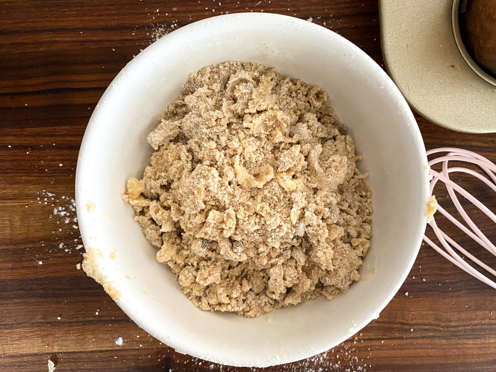 This is where the “coffee cake” part is added to these pull apart muffins – do not skip this very necessary indulgence. You will finger-combine the brown sugar, flour and butter. Just continue to press together until it eventually comes together and small sugar-butter balls are made.