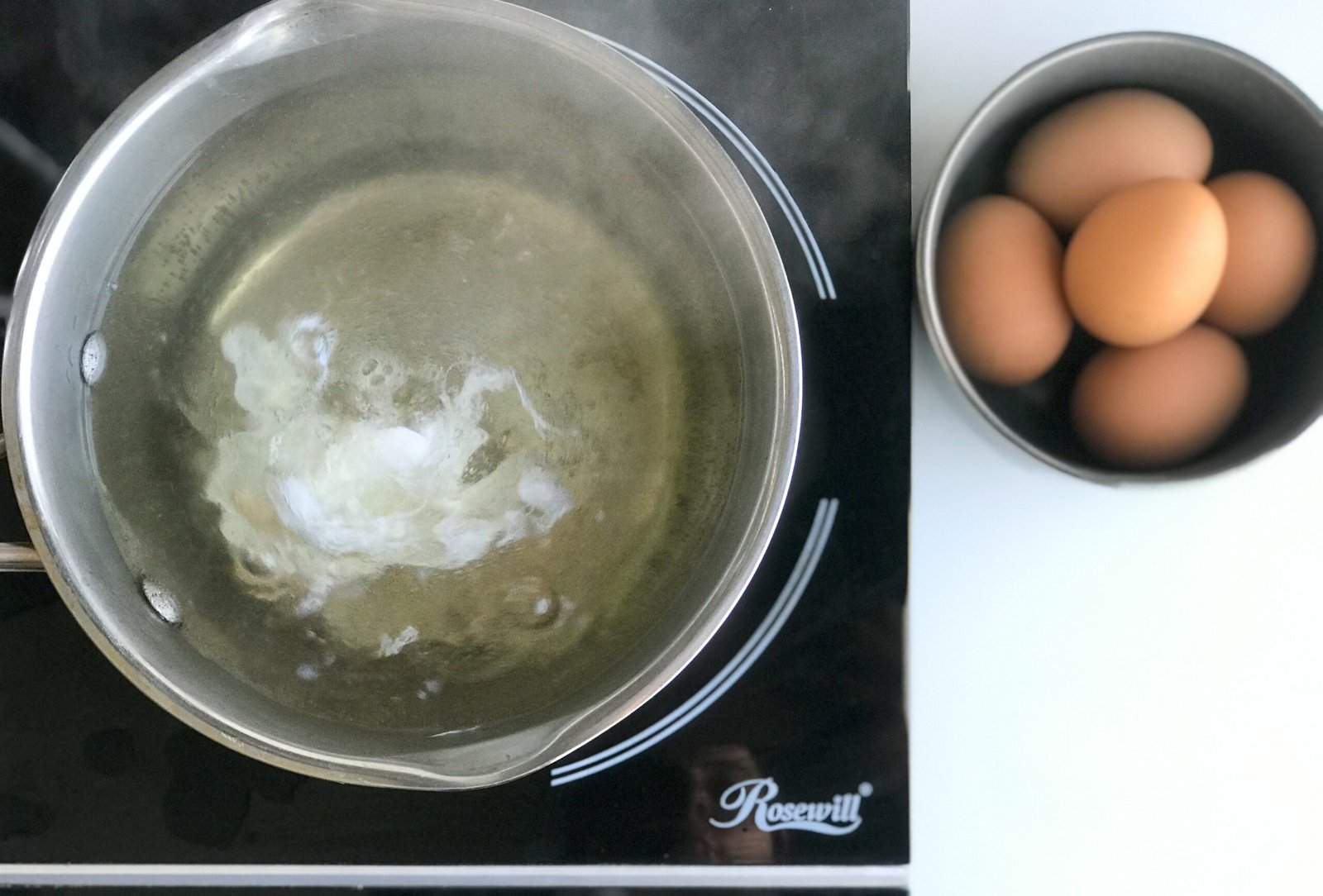 You want your water with a simmer bubble, not a boil. If your water is not hot enough the egg whites will not coagulate quickly enough, it’s it’s too hot your eggs will break. Normal poaching temperature is 170F but you don’t need a thermometer, just look for consistent small bubbles rising to the top of the pot.