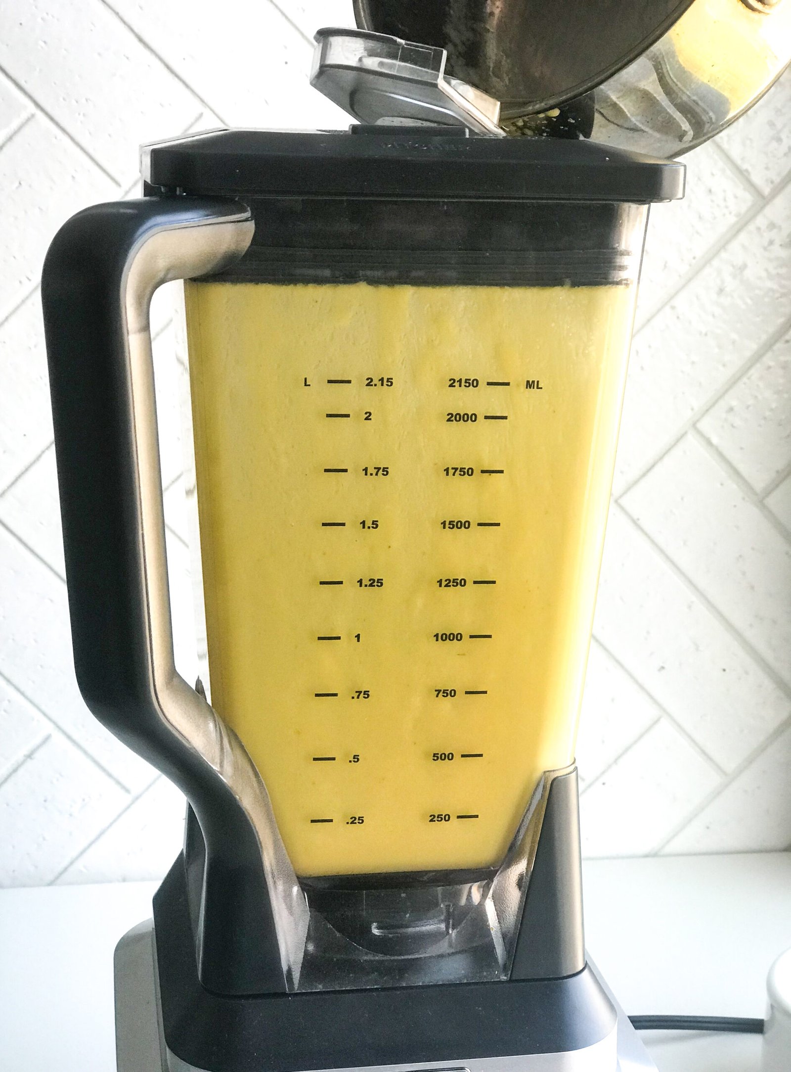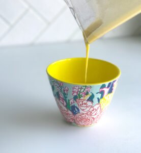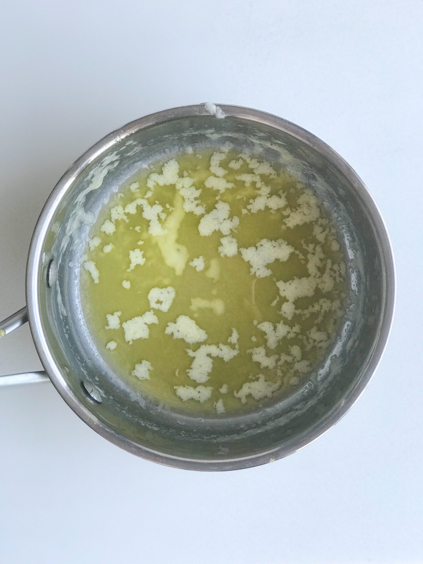 - SLOWLY drizzle the hot (180F) melted butter into the blender as it is running. It should take about one minute, try your best to leave behind the separated proteins and water (see picture). It’s important to do this slowly so that the ingredients have time to combine into a silky smooth sauce. If it’s poured too quickly, the butter will not be able to fully incorporate.