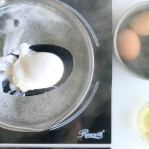 Vinegar – adding vinegar to the poaching water allows for the egg white to firm up as it wraps around the yolk so it holds the shape. Caution, you may still get some straggler loose white strings.