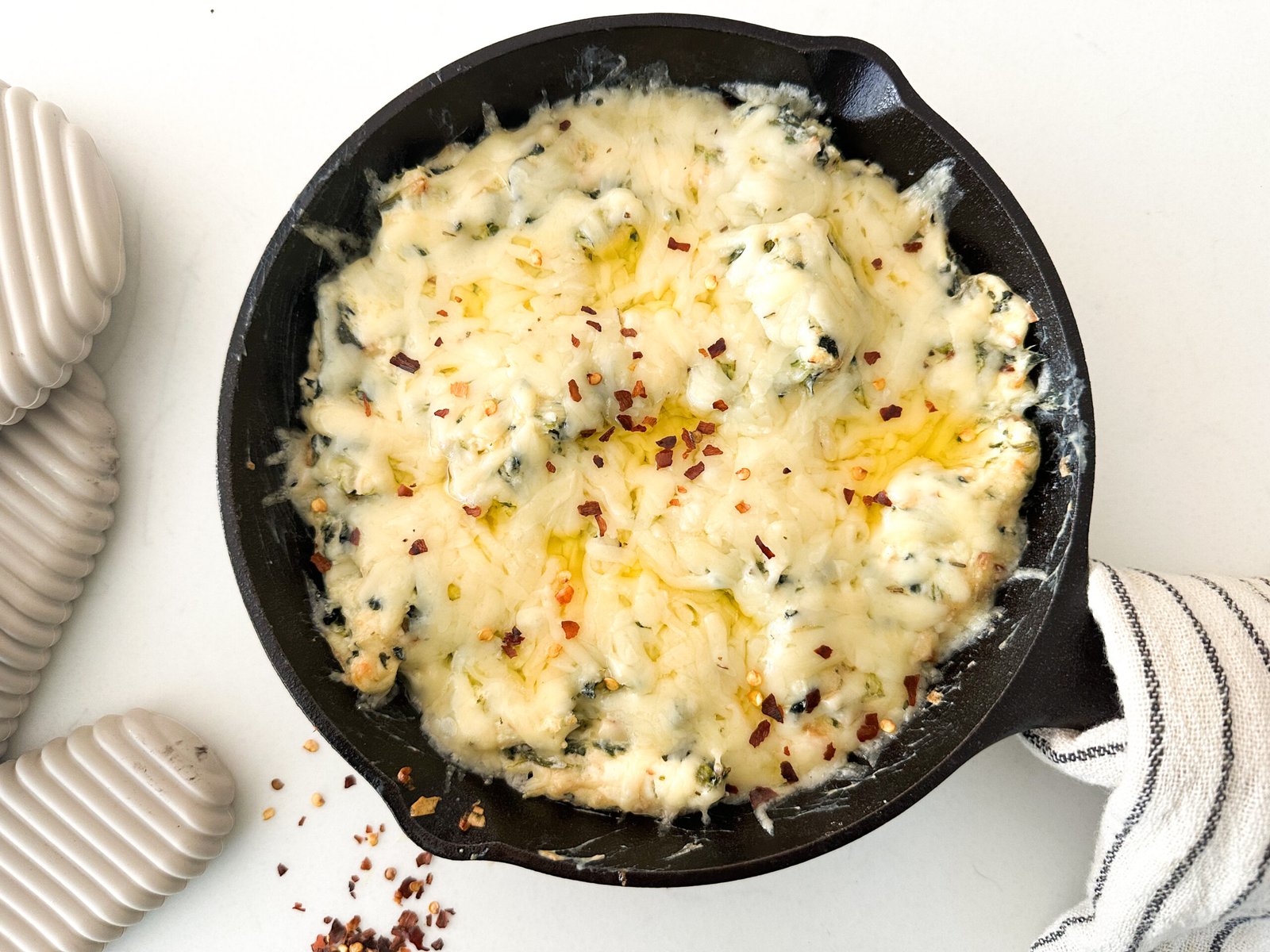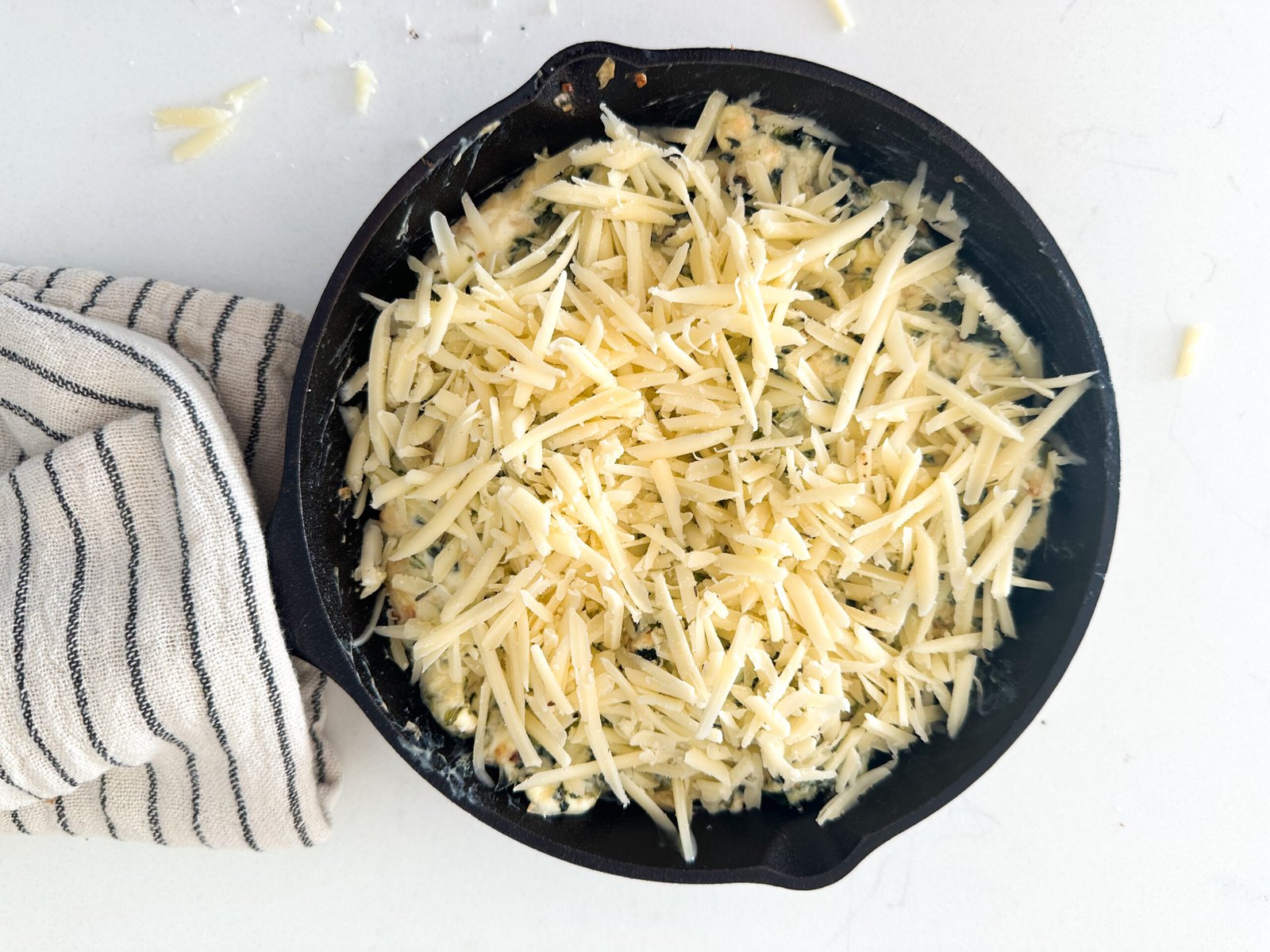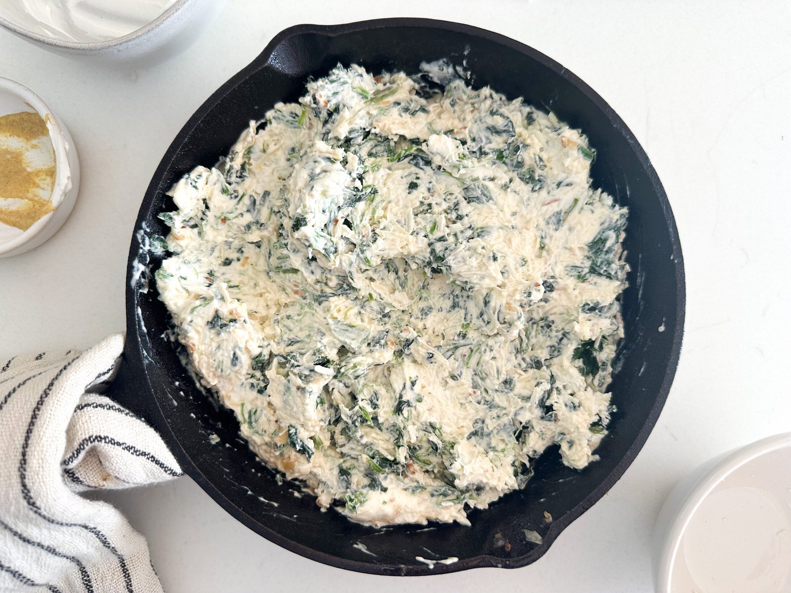 - Add the spinach dip back into the oven-safe pan used to sauté the shallot and garlic. Evenly spread out into the pan. Bake at 350F for 20 minutes.