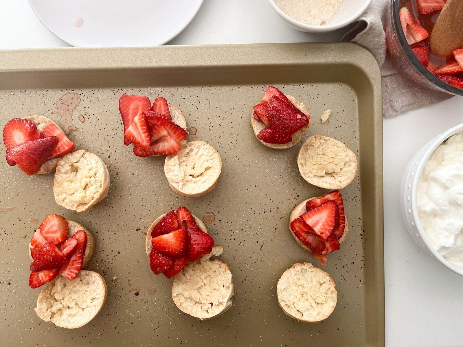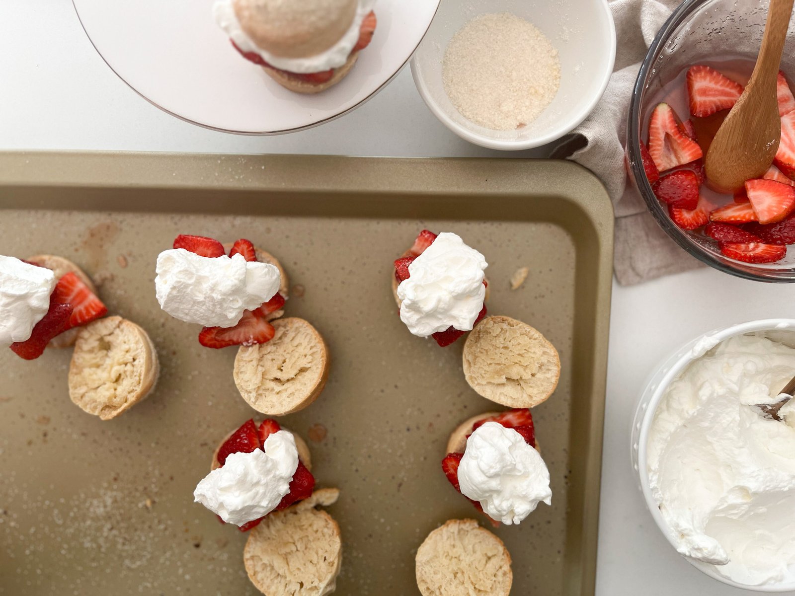 - Once the biscuits are cool, slice in half and add strawberries and a spoonful of the sweetened strawberry juice.