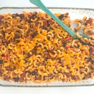 In need of a super quick and easy dinner? This easy cheesy chili mac casserole does the just the trick! Cozy chili mixed into cheesy macaroni and baked for a delicious crispy top is perfect for any chilly weeknight dinner. The best part, you can make it your own by using any chili recipe you love.