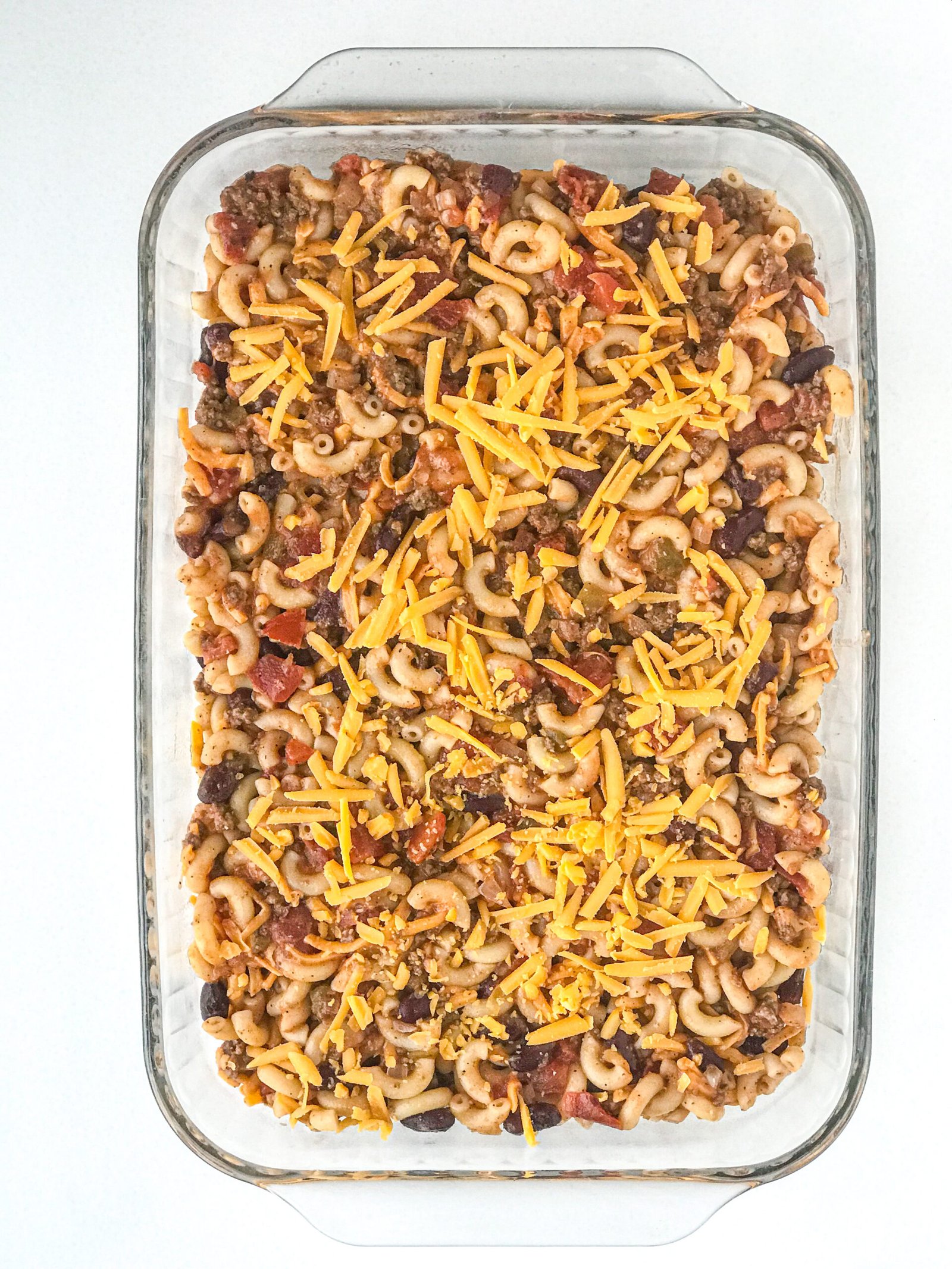 - Dump your mixture into your casserole dish and sprinkle the remainder of your cheese on top.