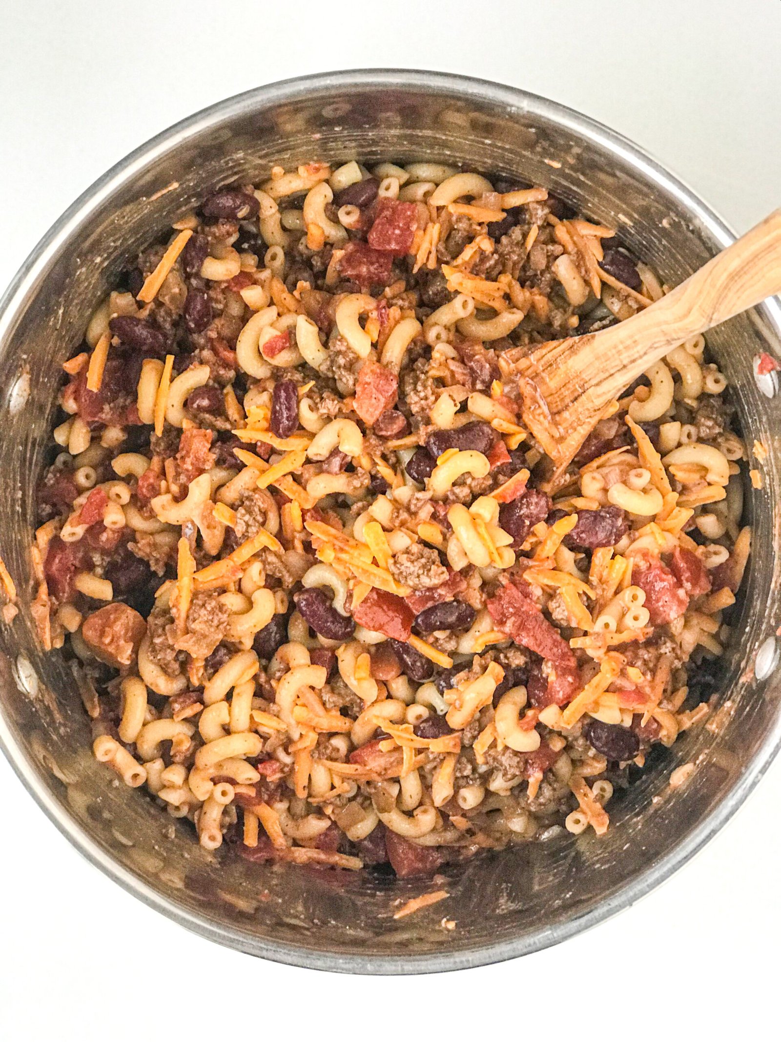 - Stir in the chili and cheese until evenly distributed. Leave a little cheese (about 1/4 cup) for the topping.