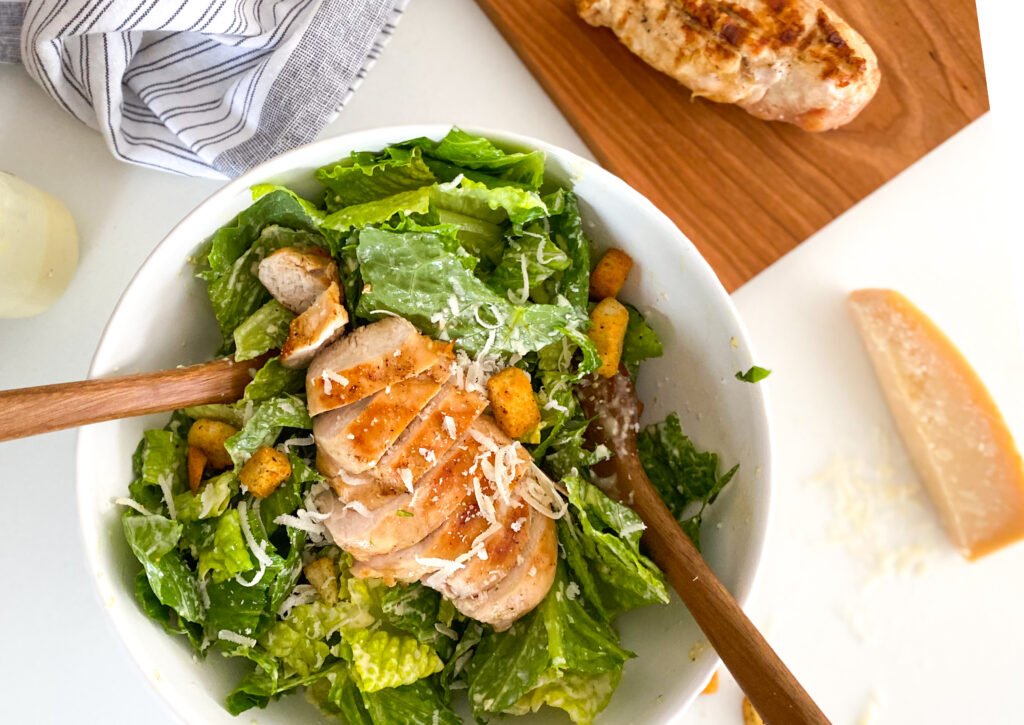 I went out to dinner a few weeks ago and after being told the cheeseburger was not a dinner option (lunch menu only) and the creamy pasta dish I ordered was no longer available, I opted for my third choice, a caesar salad with chicken. I was not expecting this decision to be life-changing but it was. The salad came, perfectly dressed and seasoned but the thing that made it memorable and crave-worthy to order again was that the chicken was perfectly grilled and still warm. The warm chicken sharing the same bite with cold crisp lettuce was everything. It was an instant obsession that I was eager to recreate to add to my meal rotation and most importantly, share with you! This is that salad, the one that you think about, crave and look forward to. It’s so simple.