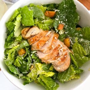 Sometimes you just want a salad and this super easy chicken caesar salad is the absolute perfect go-to for your working-from-home lunch or a quick weeknight dinner. It’s so easy to throw together for anytime. I’m so so excited about this salad.