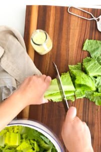 • Roughly chop your lettuce. Wash your lettuce and spin or pat dry. Place in a serving bowl.