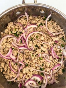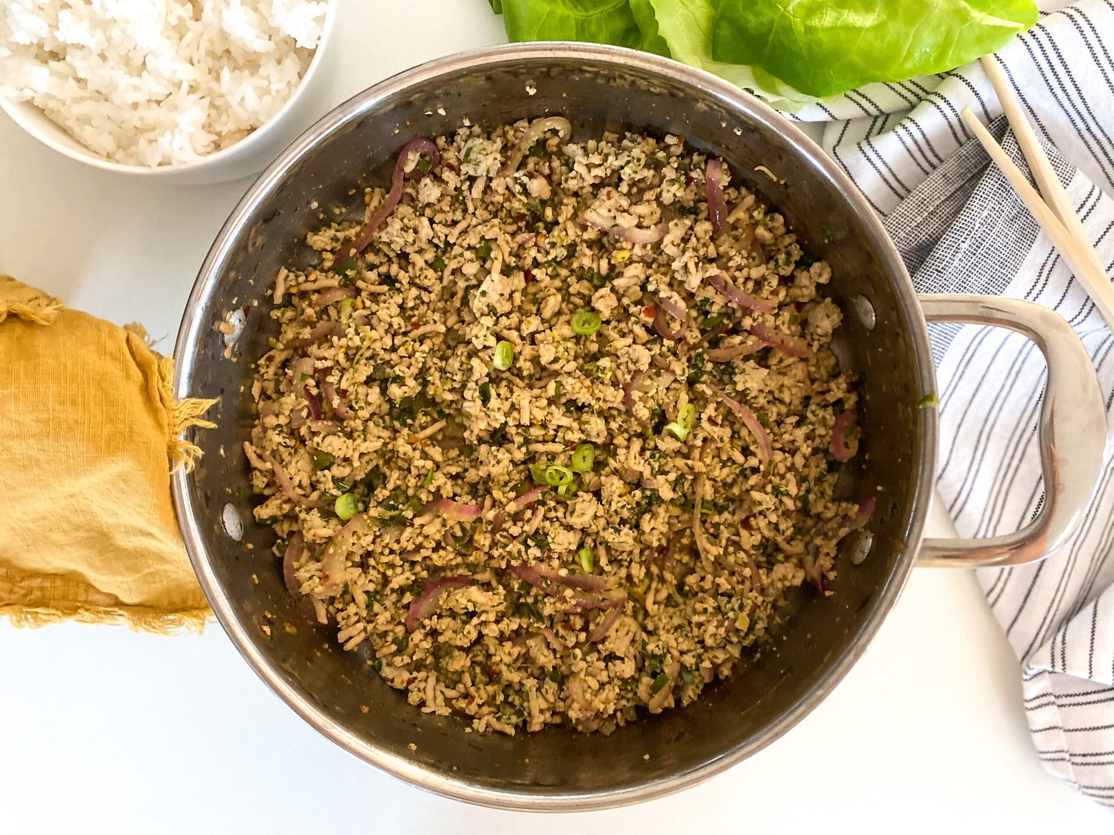 Break away from your usual dinner routine with this Thai chicken larb gai! It’s super simple and the perfect light dinner for a warm spring or summer day. This one pot recipe is full of spicy, fresh flavors and easy clean up. It comes together quicker than it takes to order take-out, a definite must make.