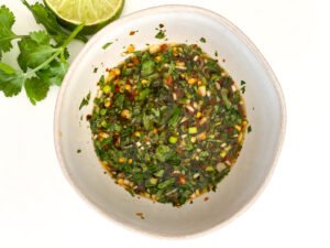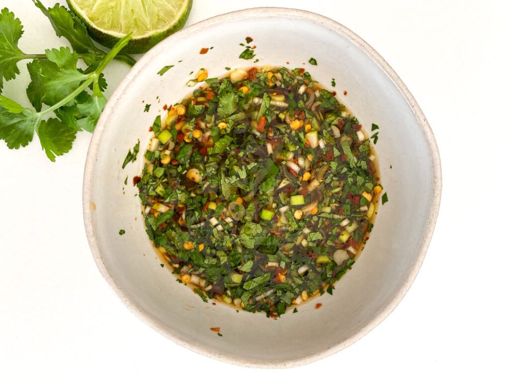 - In your spice and herb bowl combine the remainder 1 TBSP of fish sauce, the juice of two limes, 1 TBSP soy sauce, 1 TBSP of thinly sliced green onions – white part only, 1 TBSP of minced mint, 1 TBSP of minced cilantro, 1 TBSP of minced basil, 1 tsp of red pepper flakes.