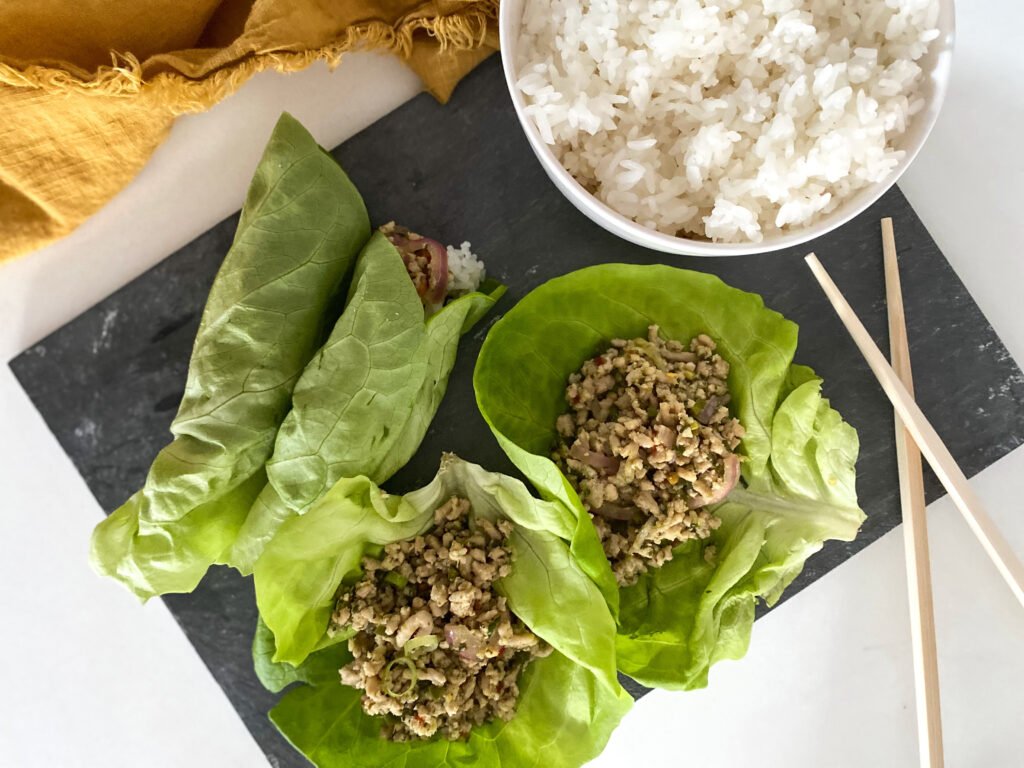 Thai chicken larb gai is a one-pot recipe that takes less than 20 minutes. I use 5 minute microwave-ready sticky rice, it turns out perfectly fluffy, sticky and it saves cleaning a pot. If you want to do lettuce wraps, the best lettuce to buy is bibb lettuce. The leaves are easy to peel back and they create a little pocket to spoon your larb gai into.