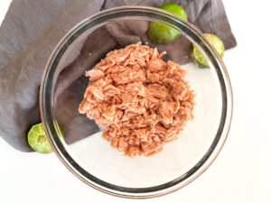 - In a bowl, add your ground chicken, 1 TBSP of fish sauce and the juice of one lime. Set it aside while you prep your spice bowl.