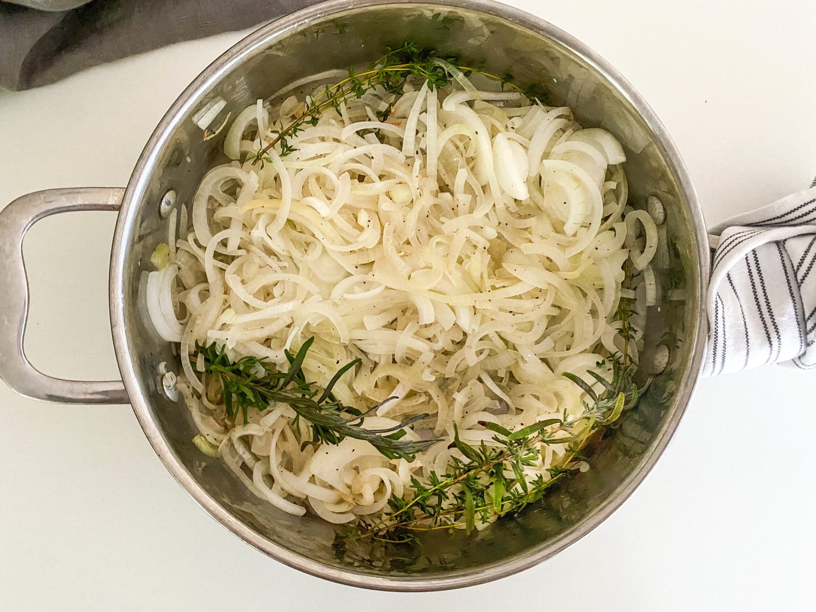 - In a large oven-safe pan, add your onions, butter, salt, pepper, thyme and rosemary.