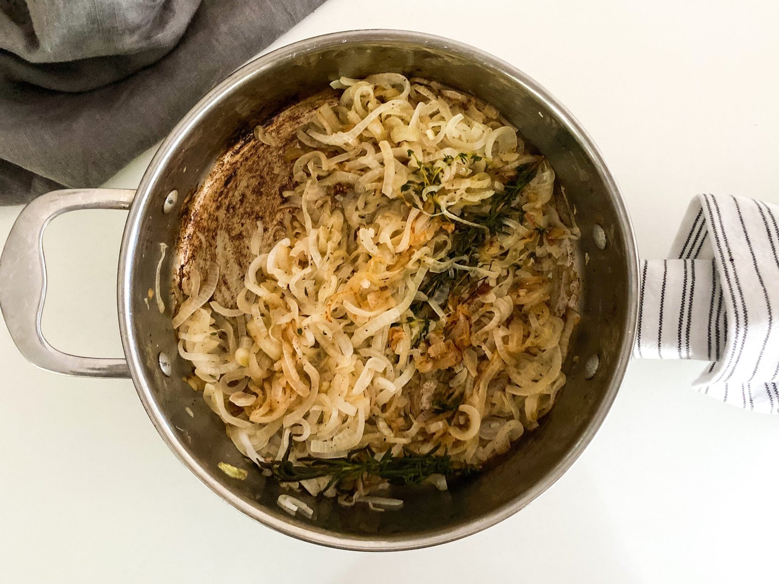 - Place your pan over medium low heat and caramelize your onions, about 20 minutes. See blog post for more details on how-to-caramelize onions.