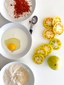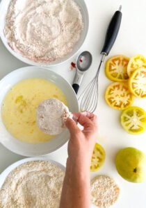 - Dip the flour covered tomato slice into the buttermilk & egg mixture to completely & evenly cover over the flour.