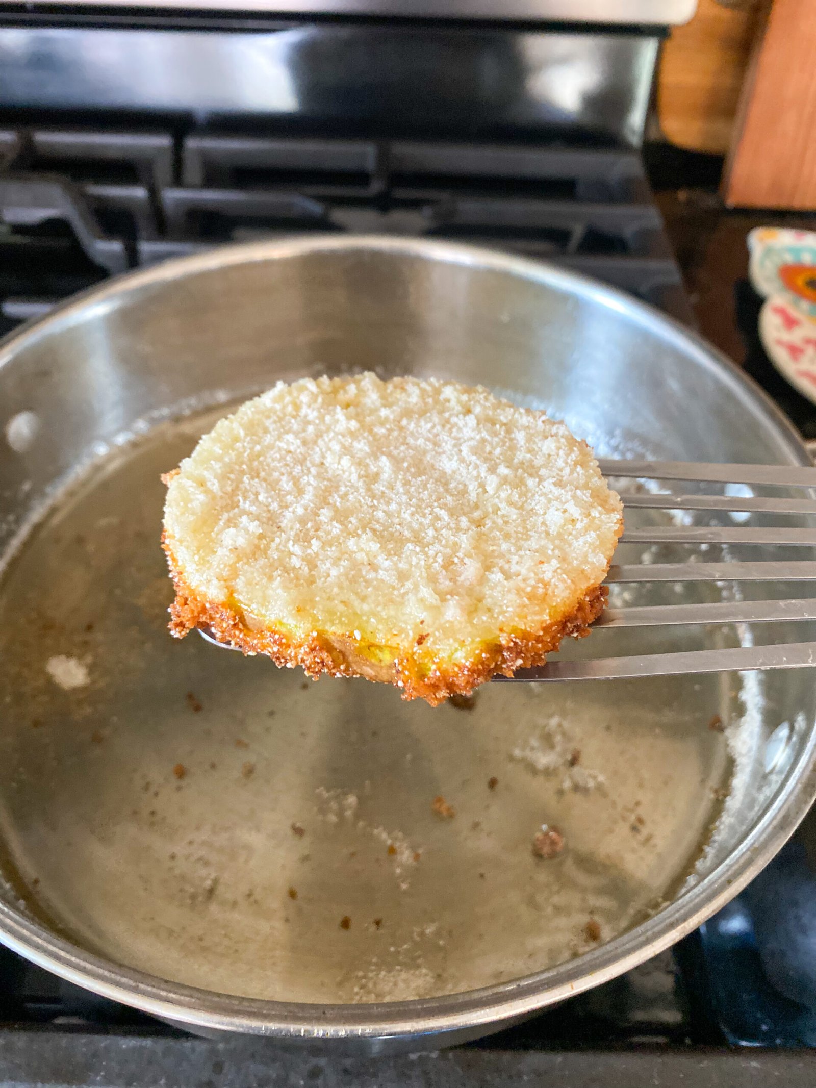 - Place your buttermilk soaked tomato slice into the cornmeal & breadcrumb mixture so that it is evenly distributed and covered, no flour or milk mixture peeking through. Set aside.