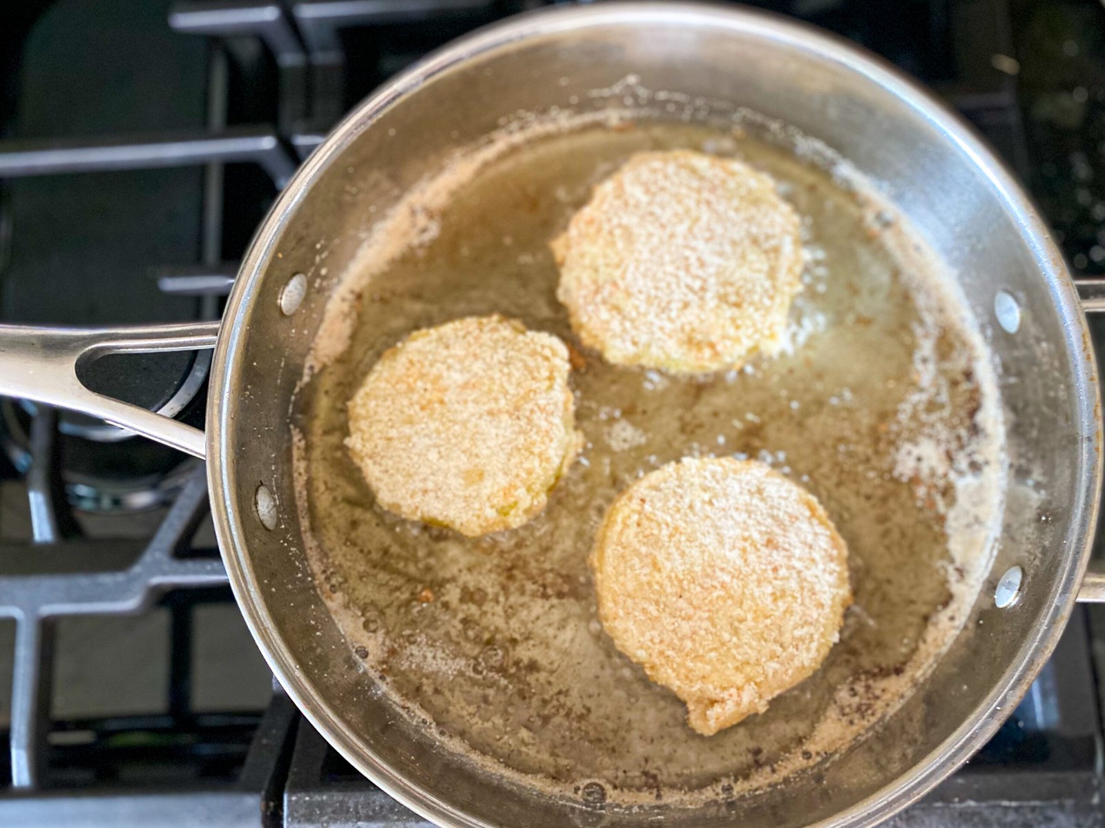 - Fry for about 3 minutes on each side – long enough to cook the tomato & to create a brown crust on the outside.
