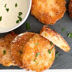 Green tomatoes are firmer, tart, and less juicy making them ideal for frying. And ideal for dipping in a smooth rich ranch dressing. It’s the perfect match up, complementary to all taste buds.