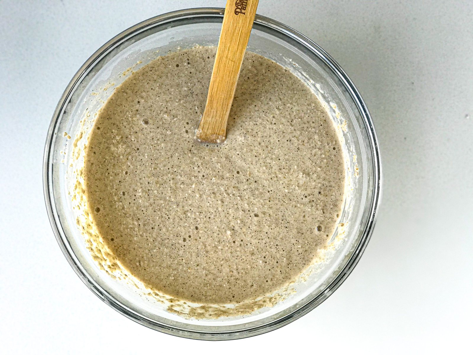 - Pour the wet ingredients into the bowl with the dry ingredients and carefully stir until it is fully combined. Makes sure to not over mix the batter. It will be lumpy and thick. It should be a between a grits and oatmeal consistency.