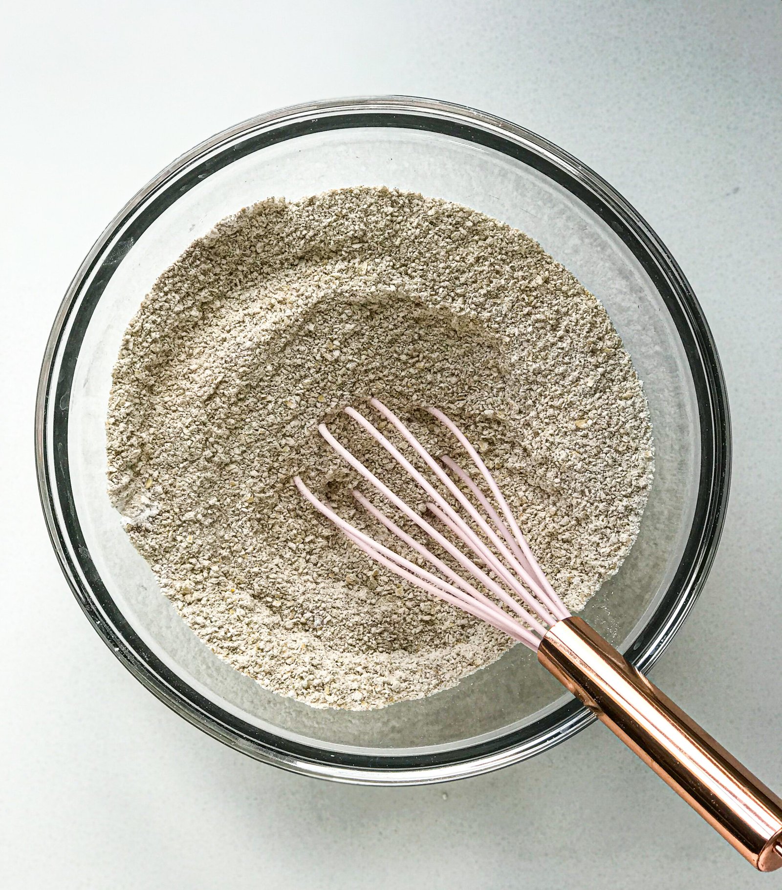 - In a large bowl, whisk together all of your dry ingredients until evenly distributed.