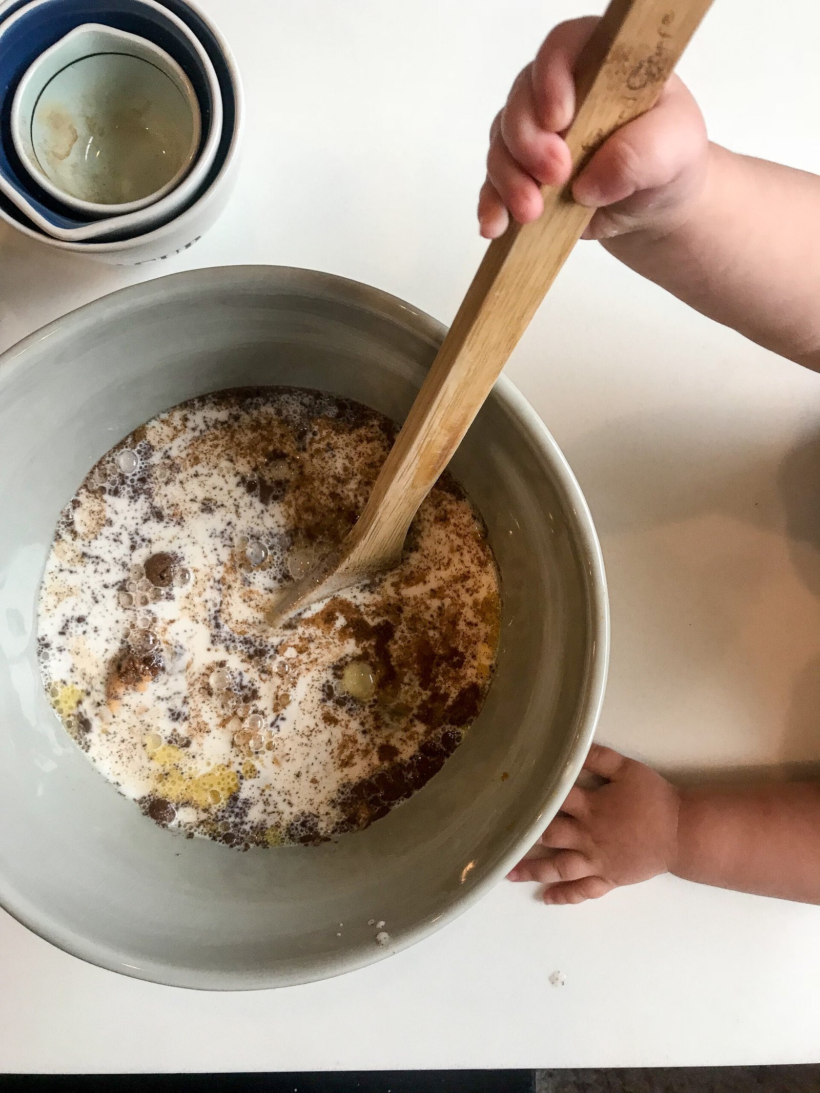 - In a large bowl, combine all of your ingredients and stir. My little helped me with this task.