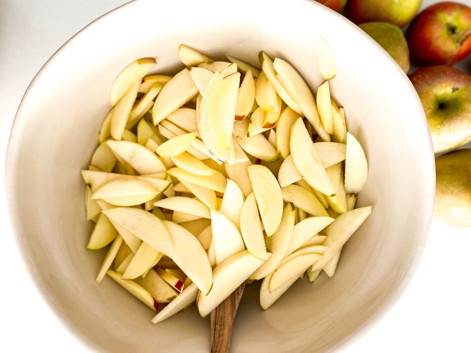 • Peel (optional), and cut your apples into evenly thin slices, about ¼ inch thick.