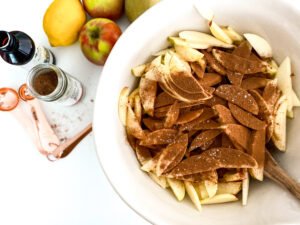 • In a large bowl, toss your apples with cinnamon, nutmeg, salt, water, freshly squeezed lemon juice, and the vanilla extract until everything is evenly covered.