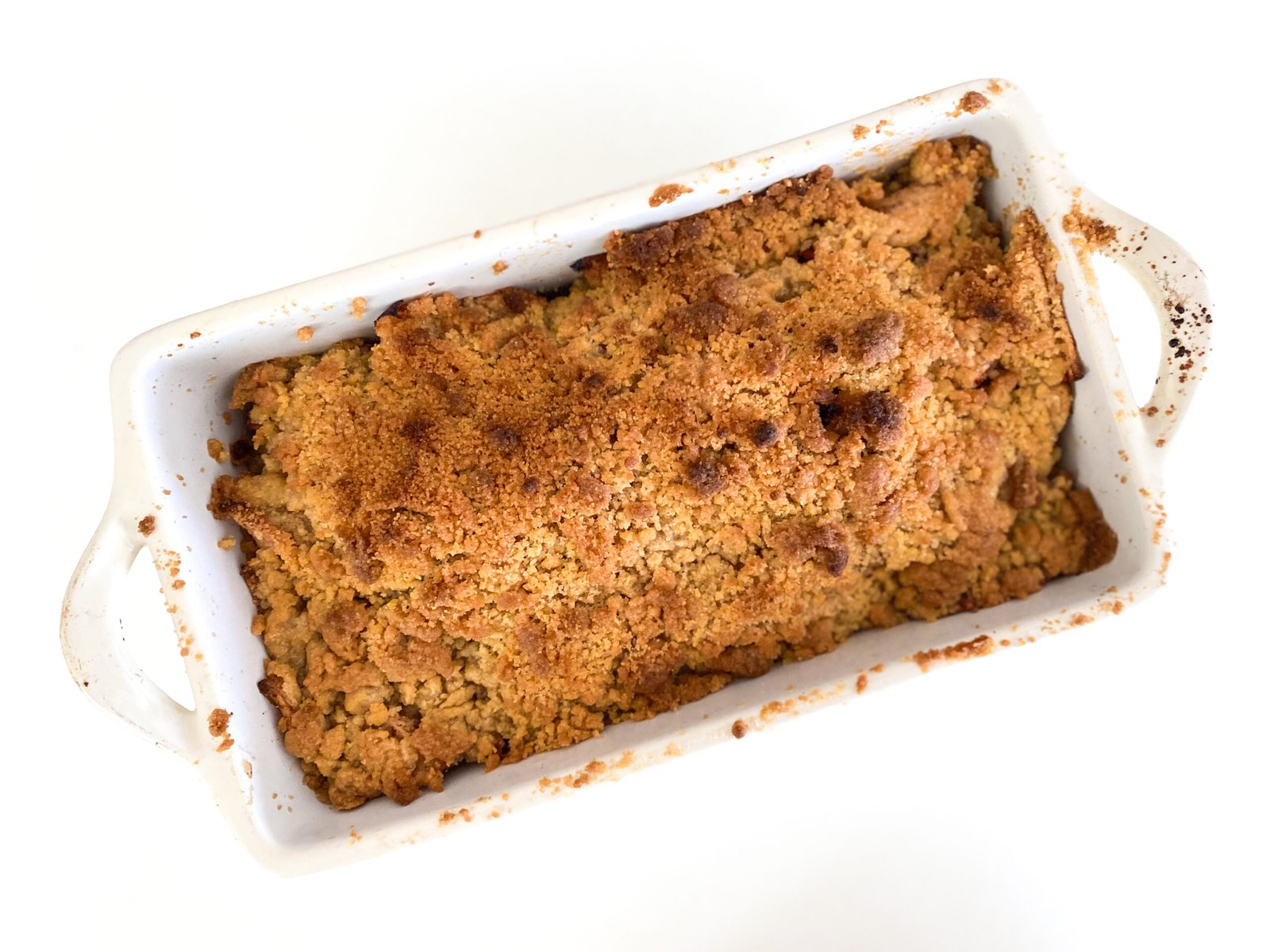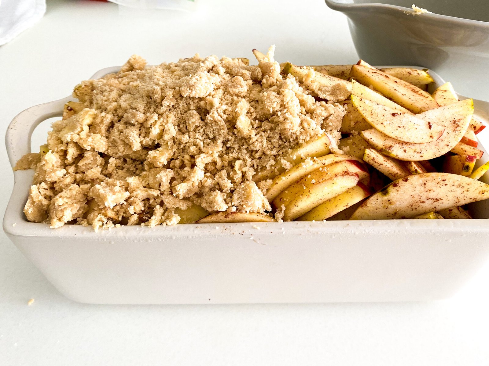 • Add your apple mixture to your loaf pan. Top with the crumble topping. Pile it high, as the apples cook, they will settle down.