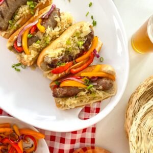These grilled brats topped in IPA sauerkraut is a fun way to change up the usual go-to grill meats and is perfect for the upcoming July 4th weekend! Grilling has become a way of life at my house. We are still working from home and living our best lives. Using the grill for our weeknight dinners gets us outside and keeps the kitchen cool and (somewhat) clean.